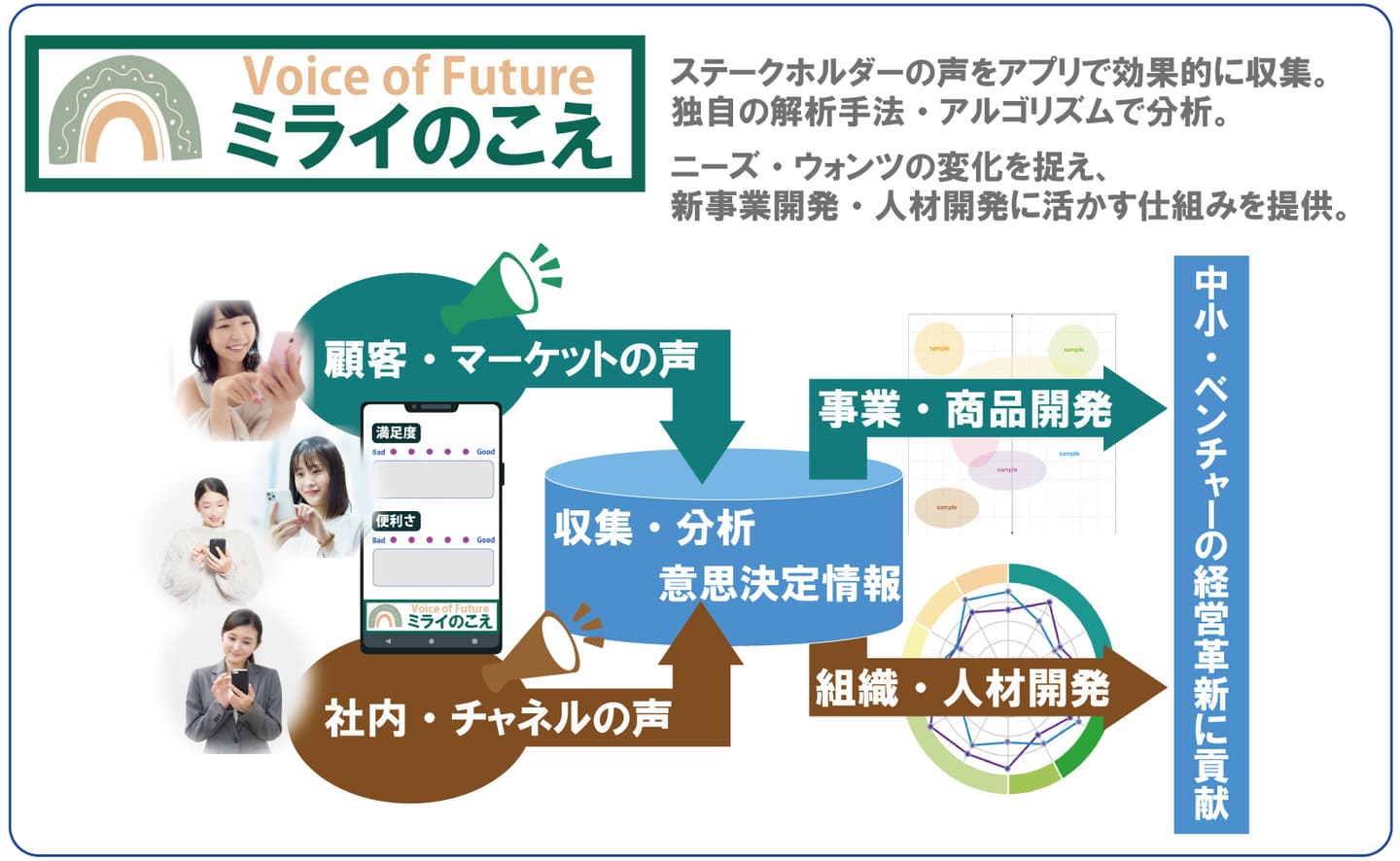 社外(市場・顧客)×社内(社員・ステークホルダー)の情報を効果的に集め、分析・仮説を立てて「商品・事業開発」「組織開発」を行う『ミライのこえ』をベースにしたコンサルティングサービスを提供しています。