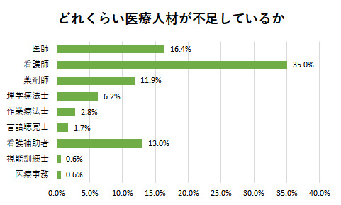 177の医療機関から回答を頂いた結果、16.4%の医療機関が「医師」不足、35.0%の医療機関が「看護師」不足、11.9%の医療機関が「薬剤師」不足、13.0%の医療機関が「看護補助者」不足という結果になりました。