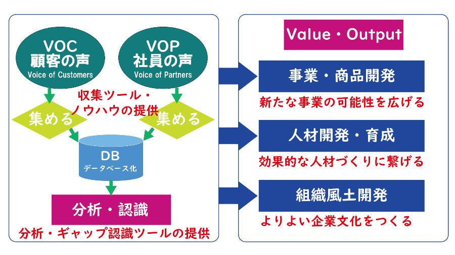 新事業展開・新サービス開発、人材開発につなげるためには社内外のニーズやウォンツを言語化し、分析するプロセスが必要であり、当社はこの方面に力を入れています。